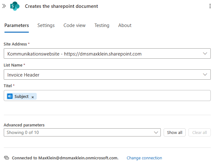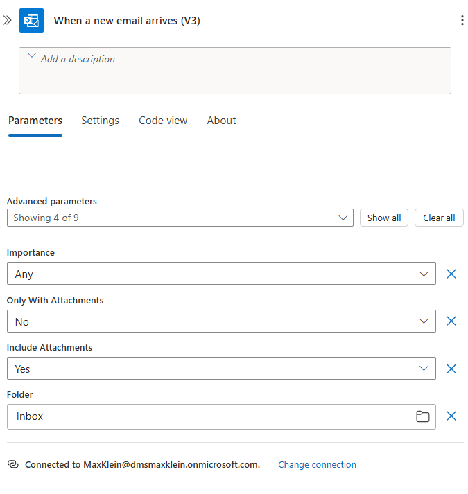 1. Trigger: When a new email arrives (V3) im Ordner „Inbox“ (Office 365 Connector), splitOn auf @triggerBody()?[‚value‘] → jede Mail wird als eigener Run verarbeitet.