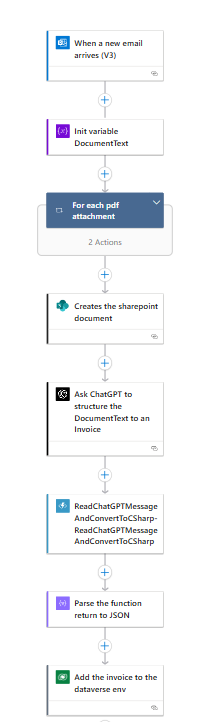 • In jeder Iteration Add a new row in cr9c6_invoicelines (oder Ihre Tabelle).
